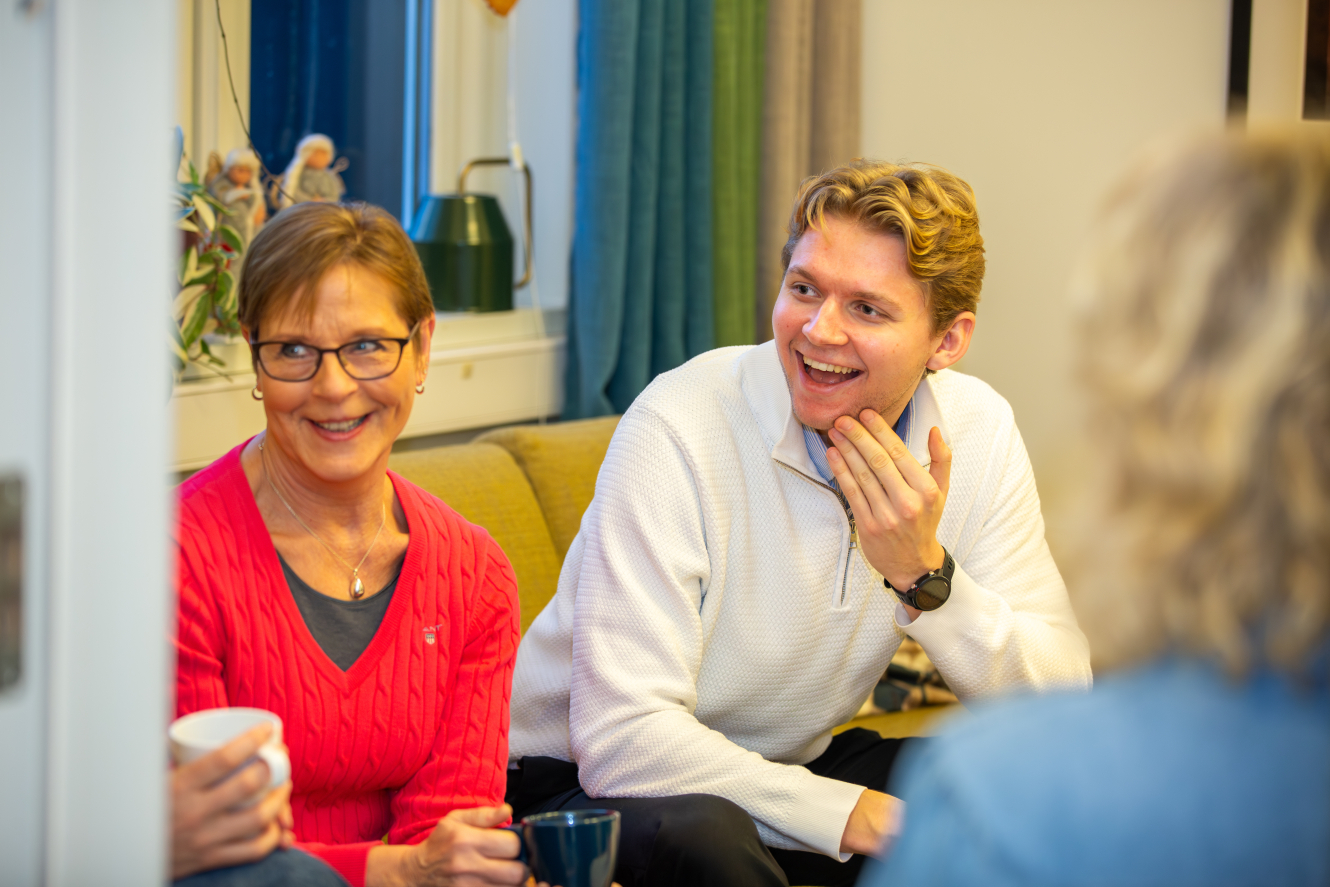 Frivillige på vaktrommet til Kirkens SOS i en pause. – Det er som et lite community, med folk i alle aldre og med helt ulike liv. Jeg har snakket med frivillige som har holdt på i 26 år, og vi har gode samtaler i pausene, forteller Johannes.